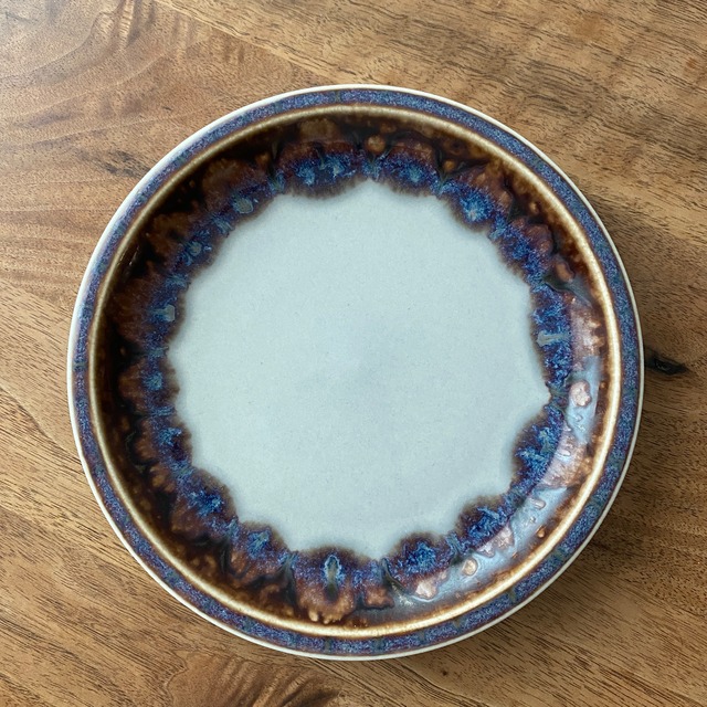 ダンスクを創業したデンマークのデザイナー、 クイストゴー(Jens.H.Quirtgaard)による、 Mexico / メキシコシリーズの 16.5㎝ケーキプレートです。 釉薬が味わい深い作品で、 茶色や紫、赤、青などの 複雑な色合いを見せてくれます。 作品ごとに異なる 生き生きとした釉薬が 素晴らしいです。 日本の焼き物にも通づるデザインは、 和菓子などもよく似合います。 厚手でしっかりとした作りなので、 気軽に普段使い用の器として重宝しそうです♪ B&G(Bing & Grondahl )時代の ロゴが押されています。 表面に少し小傷があります。 そのほかにダメージはなく、 全体として綺麗なコンディションです。 【サイズ】直径16.5㎝ 《当店で取扱うビンテージ食器について》 1950年代頃から1980年代頃に使用されてきたものとなります。 昔の製造上の突起や貫入などビンテージ品ならではの特徴がございます。 写真では載せきれない細かな傷などがあることもございます。 そのアイテムの辿ってきた歴史やストーリーも含めて、 そのものの味わいと捉えて、楽しんで頂けましたら幸いです。